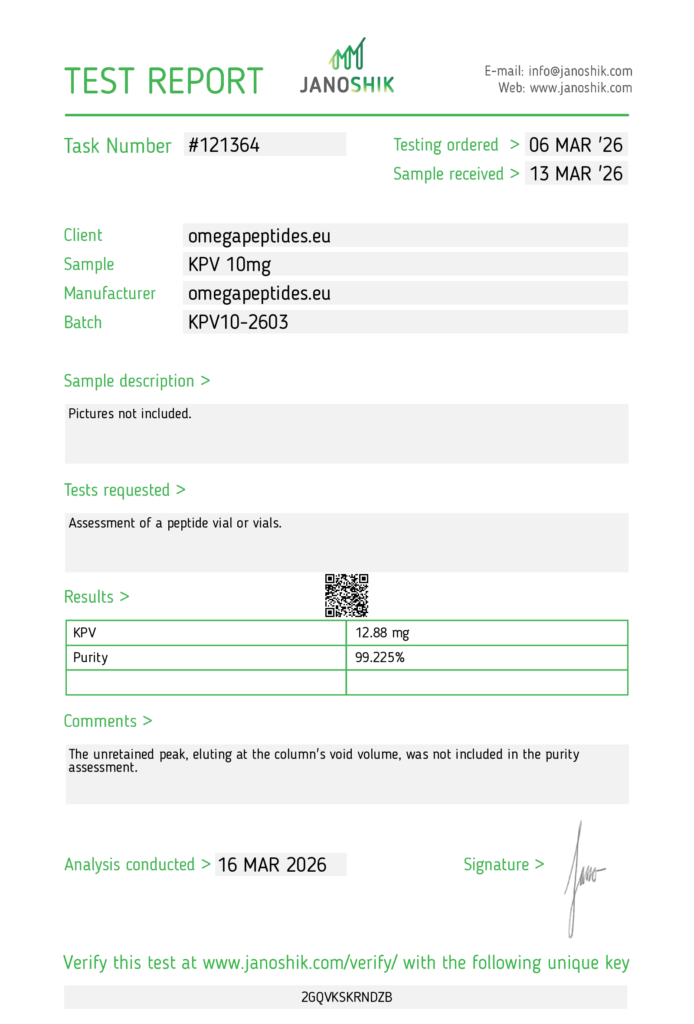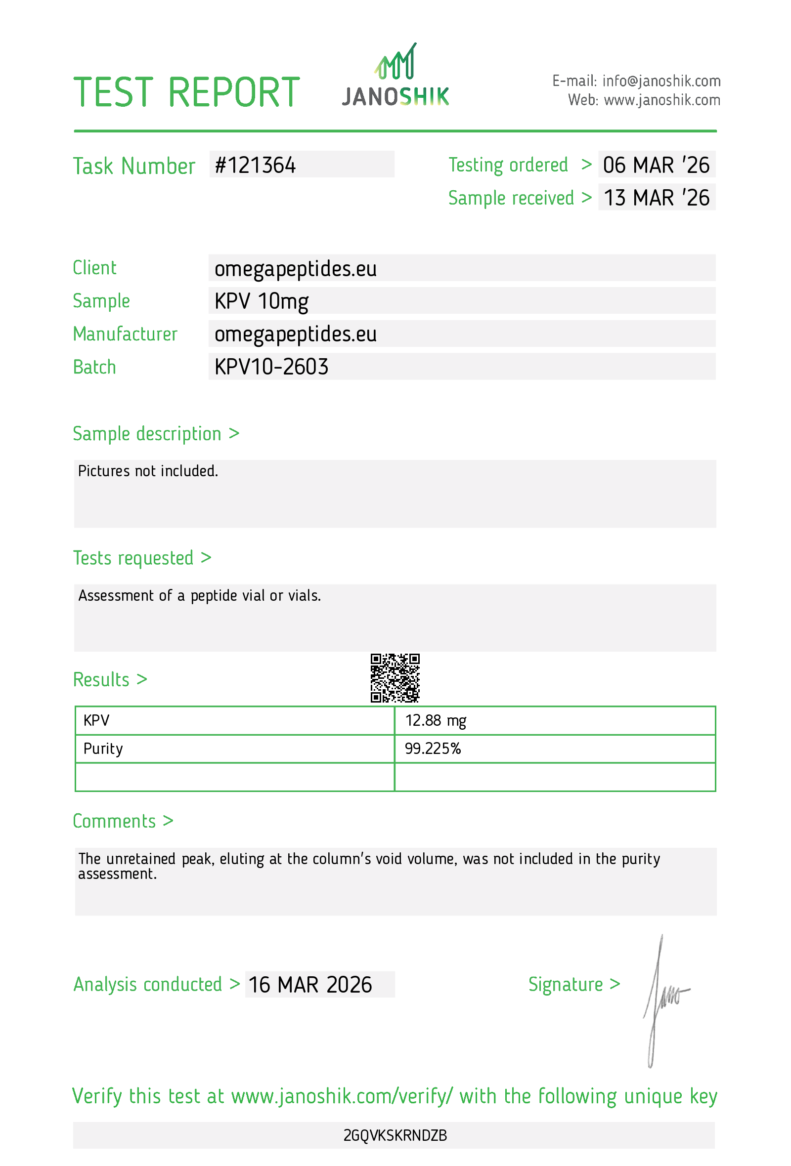 At the molecular level, KPV has been explored for its ability to influence inflammatory signaling pathways, reduce pro-inflammatory cytokine activity, and support cellular resilience under stress conditions. Its stability and small size allow for efficient interaction in various experimental models.